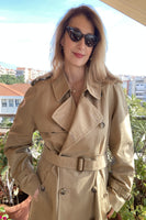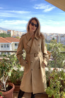 A timeless, vintage , long trench coat, 100% cotton (main fabric and lining).  Double-breasted fastening with buttons, belted waist and side pockets. This trench coat combines elegance with everyday functionality.