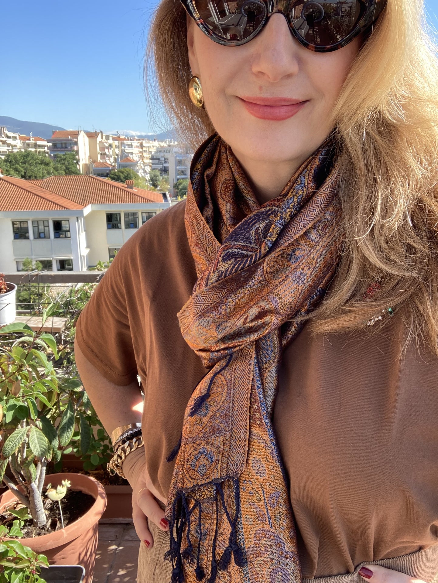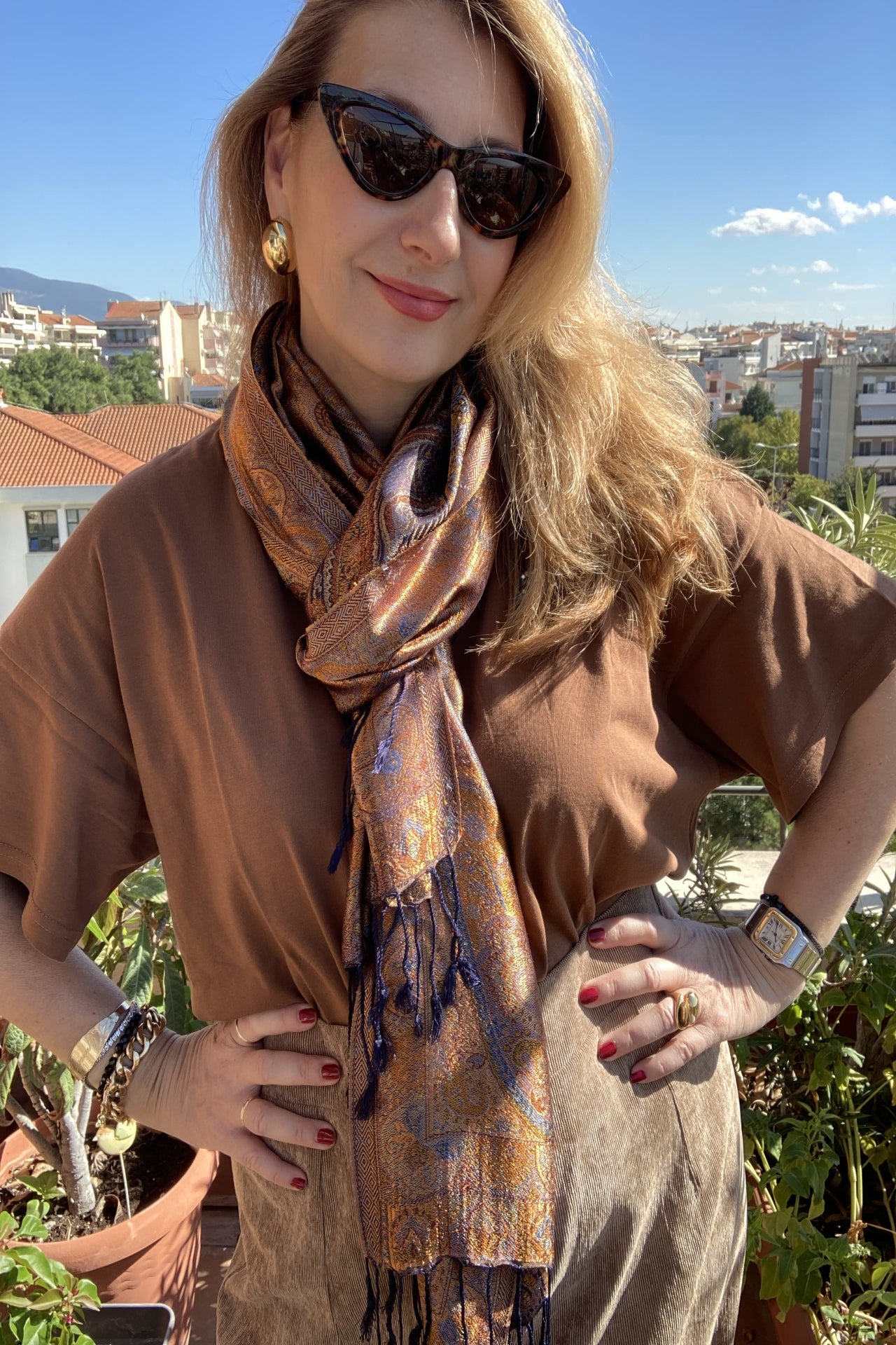 Silk scarf with a beautiful paisley pattern in shades of blue, brown and cinnamon colors. It can be used as a shawl.